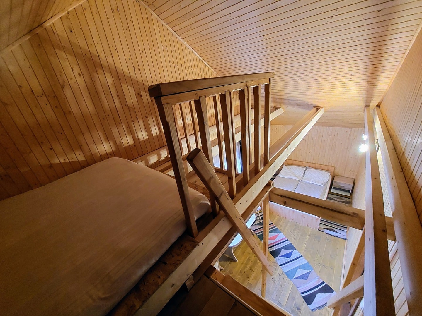 În camera de zi de la parter există un pat mare, iar în camera de zi de la etaj sunt două canapele mari, de tip pat, de mărimea unor paturi matrimoniale. Baia de la etaj are ușa spre exterior.